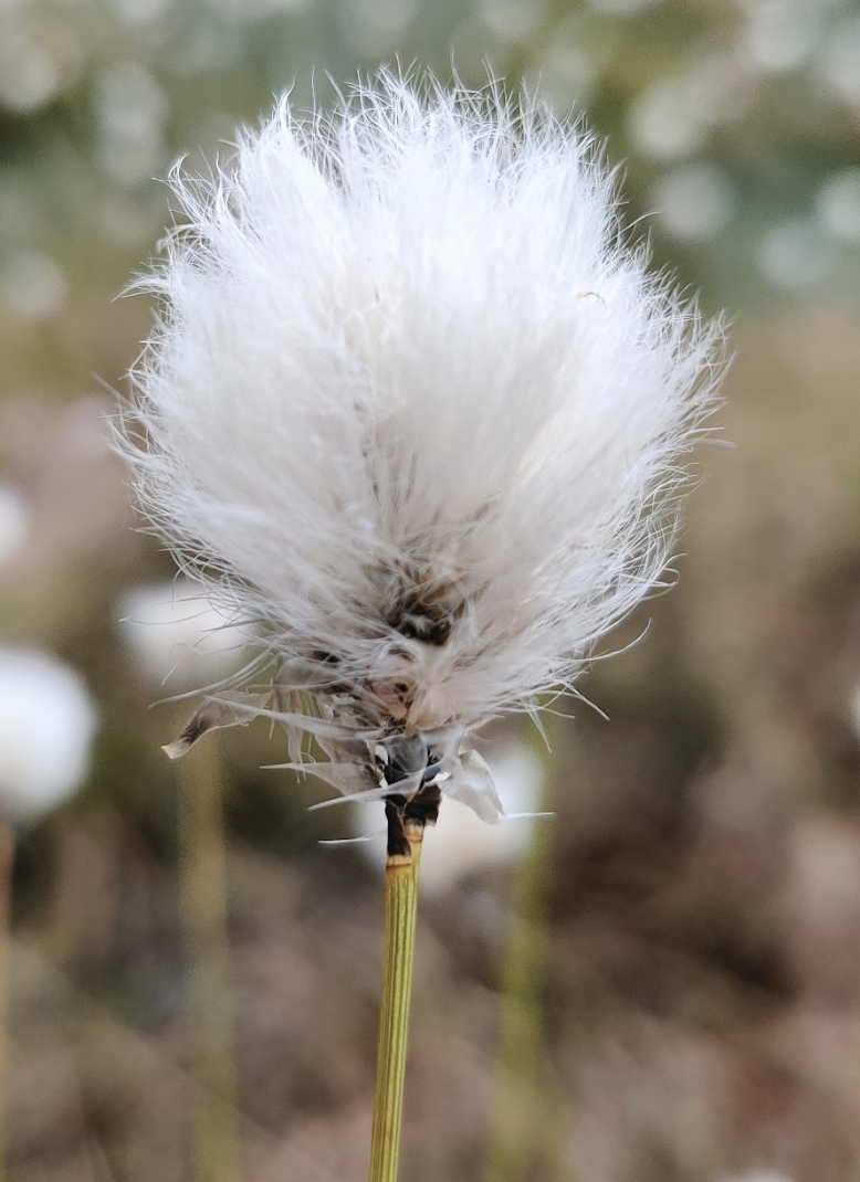It comes in two Hare’s tail Cottongrass (Eriophorum vaginatum) and Common Cottongrass (Eriophorum angustifolium). The two plants are very similar, with white fluffy cotton seed heads and grassy leaves which are seen from June each year. The white cotton flowers with seeds attached are easily dispersed by the wind.